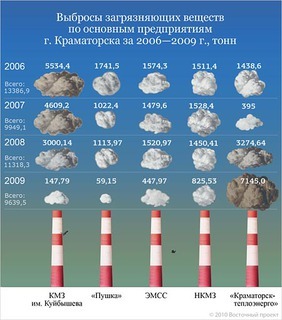 Общую картину снижения вредного воздействия нарушает, причем существенно, ООО "Краматорсктеплоэнерго". За период с 2006 по 2009 год предприятие нарастило объемы выбросов с полутора до семи тонн в год. Так город ощутил переход работы ТЭЦ с газа на твердое топливо.