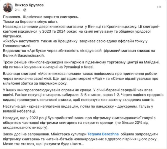 "Началось. Ежемесячное закрытие книжных магазинов. Только за март - минус шесть. Навсегда закрыли свои двери книжные магазины в Виннице и Кропивницком. Эти книжные магазины-кафе открылись в 2023 и 2024 годах на волне энтузиазма и обещаний правительственной поддержки. "Якабу" на следующей неделе на Крещатике закрывает свою единственную оффлайн-точку в Главпочтамте. Издательство "АртБукс" из-за убыточности ликвидирует свой фирменный книжный магазин на Большой Васильковской.