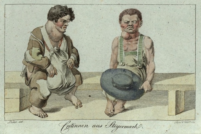 В альпийских деревнях Австрии, Франции, Германии и Швейцарии данные отклонения наблюдались у большей части населения. Географический характер распространения неинфекционного заболевания даже породил диагностический термин - альпийский кретинизм, а увеличенный зоб был настолько привычен для местного населения, что :