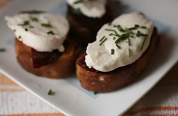 Положить на багет ломтик свеклы, а сверху – кусочек моцареллы или бурраты. Посыпать кростини шнитт-луком и подавать.
