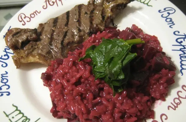 Добавьте в кастрюлю рис и жарить, помешивая, в течение 2-х минут. Влить 1 чашку бульона и варить на умеренном огне, помешивая, пока рис не впитает почти весь бульон. Продолжать добавлять по 1 чашке бульона по мере впитывания, до готовности риса, около 25 минут. Добавить свеклу и сыр, перемешать. Готовить, помешивая, пока свекла не прогреется; добавить несколько столовых ложек воды, если ризотто слишком густое.