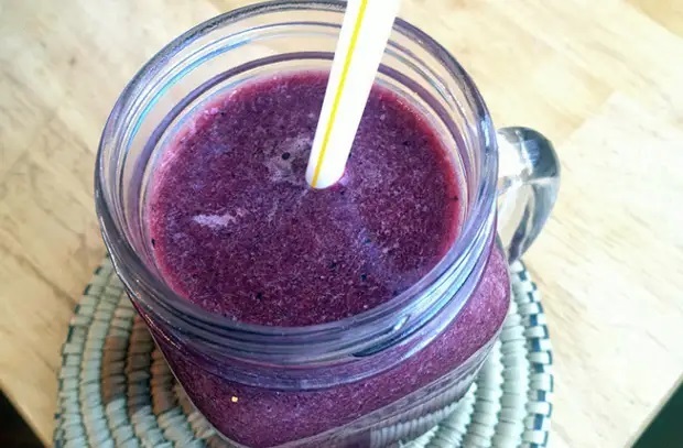 Пюрировать вместе до однородной массы миндальное молоко, ежевику, свеклу, мяту, сок лайма, семена чиа, мед, соль и половину чашки льда. Готовый смузи перелить в бокал.