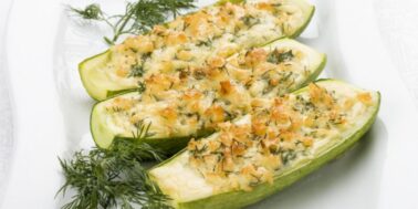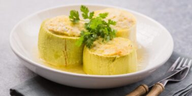 - В отдельной миске смешайте творог, рубленую зелень, пропущенный через пресс чеснок, яйцо, соль и перец. Начините смесью кабачки.