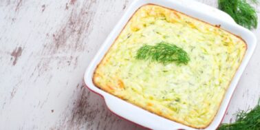 - В это время взбейте яйца с молоком. Добавьте к ним зелень и перец. Получившейся смесью залейте кабачки.