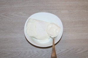шаг 6. Подготовьте творожную начинку. Смешайте творог с сахаром и ложкой сметаны.