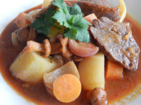 Мякоть говядины, тушёная с сезонными овощами в красном вине с лесными грибами и розмарином, – вот так можно кратко описать это блюдо. Овощи очень нежные, мясо тает во рту, а полученная подлива просто создаёт ощущение радости в такие грустные осенние вечера. Готовить нужно начать накануне, чтобы овощи и мясо успели промариноваться.