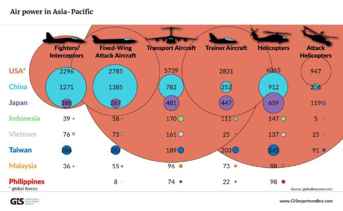 Соотношение ВВС тихоокеанских стран. США это красные круги