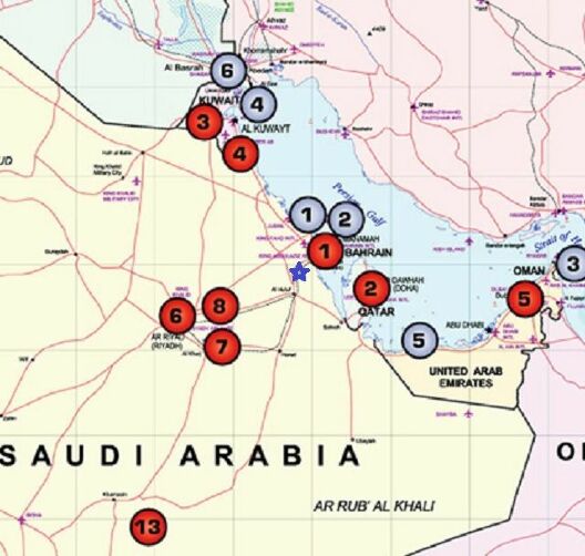 В первую очередь нас интересуют красные кружочки с цифрами 1,2,7,8, а также голубые – 1 и 2. Красные – это базы ВВС: Шейх Иса (куча самолётов КМП США), Эль-Удейд (до 120 британских и американских самолётов), Рияд, Эскан. Голубые – базы ВМС: база поддержки флота в Бахрейне и аэродром Мухарррак (британские силы и КМП США).