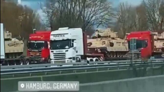 Тем временем, в сети публикуют кадры, на которых на дорогах Германии запечатлены колонны бронетехники.