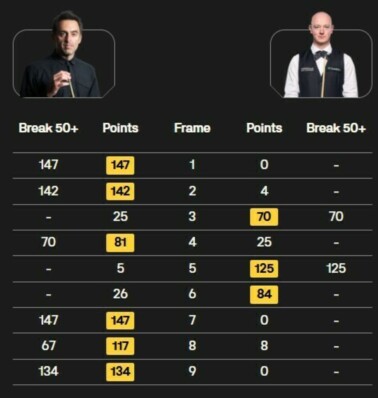 Финал между Ронни и Нилом начнется 16 августа в 13:00 (8 фреймов), остальное с 19:30, игра до 10 побед в фреймах. Победитель получит £500 тысяч и трофей, второе место – £200 тысяч. Всего в истории снукера сделано 222 максимума, пять из них – в этом сезоне.