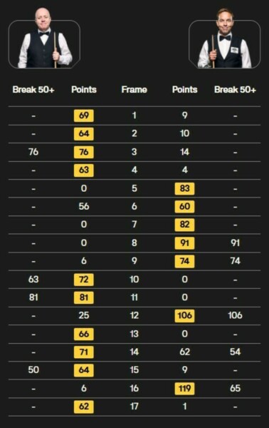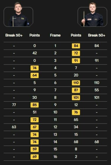 Уилсон продемонстрировал характер, который принес ему титул в 2024 году, выиграл 7 последних фреймов подряд и отпраздновал победу эмоциональным жестом – кулаком вверх. Избежав громкой сенсации в Шеффилде, второй номер мирового рейтинга вышел в 1/8 финала, где встретится с Марком Алленом.