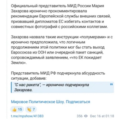 Поскольку все эти рекомендации напрямую касаются России, её реакция не заставила себя ждать. Европе всё сказала официальный представитель внешнеполитического ведомства Мария Захарова.